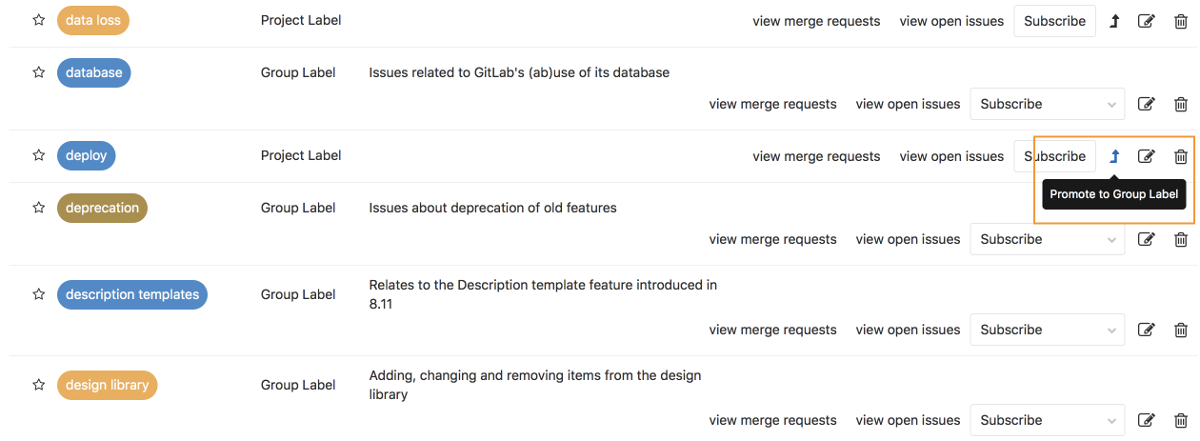 From the project label list page, you can promote a project label to a group label. This will merge all project labels across all projects in this group with the same name into a single group label. All issues and merge requests that previously were assigned one of these project labels will now be assigned the new group label. This action cannot be reversed and the changes are permanent.